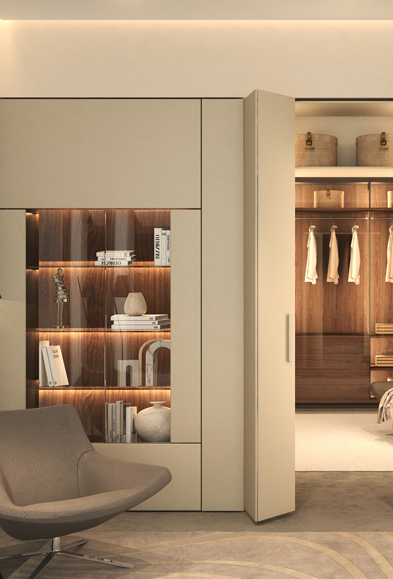 High-quality materials like wood, fabrics, and glass are combined with lacquered surfaces, showcasing the craftsmanship and production excellence of the brand. Strategic lighting and innovative furniture solutions complete a project that celebrates Italian design through a modern and international vision.