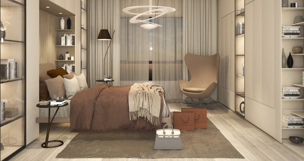 Perched on the 25th floor in the heart of Beijing, this exclusive apartment was designed for a young, career-driven woman with a passion for sports and sophisticated design. Spread across a single level, the layout offers wide, fluid spaces bathed in natural light, with breathtaking views over the city skyline. The entrance sets the tone with a striking personal statement: a curated display of three limited-edition carbon fiber bicycles, showcasing the owner’s love for cycling and design objects. The apartment features three master bedrooms, each with its own en-suite bathroom and walk-in wardrobe. At its core, a spacious open-plan living and dining area blends seamlessly into a Western-style kitchen with island—perfect for entertaining friends and enjoying elegant, informal gatherings. The design embraces a warm, welcoming Morandi-inspired color palette, crafting an atmosphere of understated elegance and calm sophistication. Every detail reflects the owner’s lifestyle: dynamic, refined, and personal.